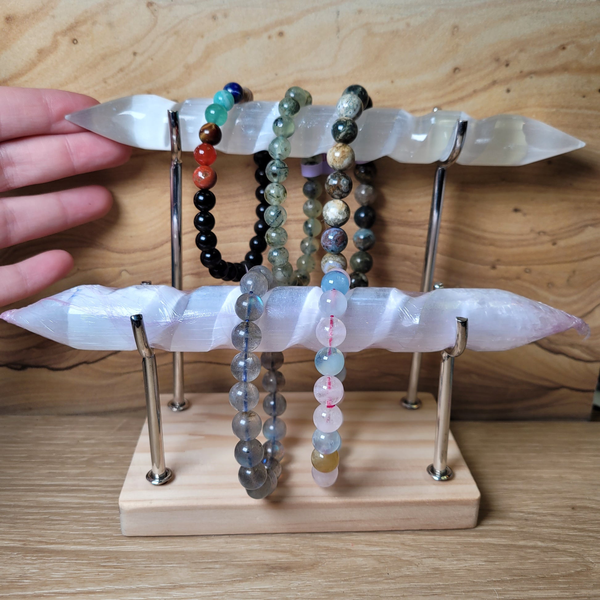 Crafted with function in mind, this holder helps prevent tangling and keeps bracelets visible and accessible. Its sleek design complements your crystals and accessories without overshadowing their natural beauty, making it perfect for home décor or as a curated accent in a spiritual space.