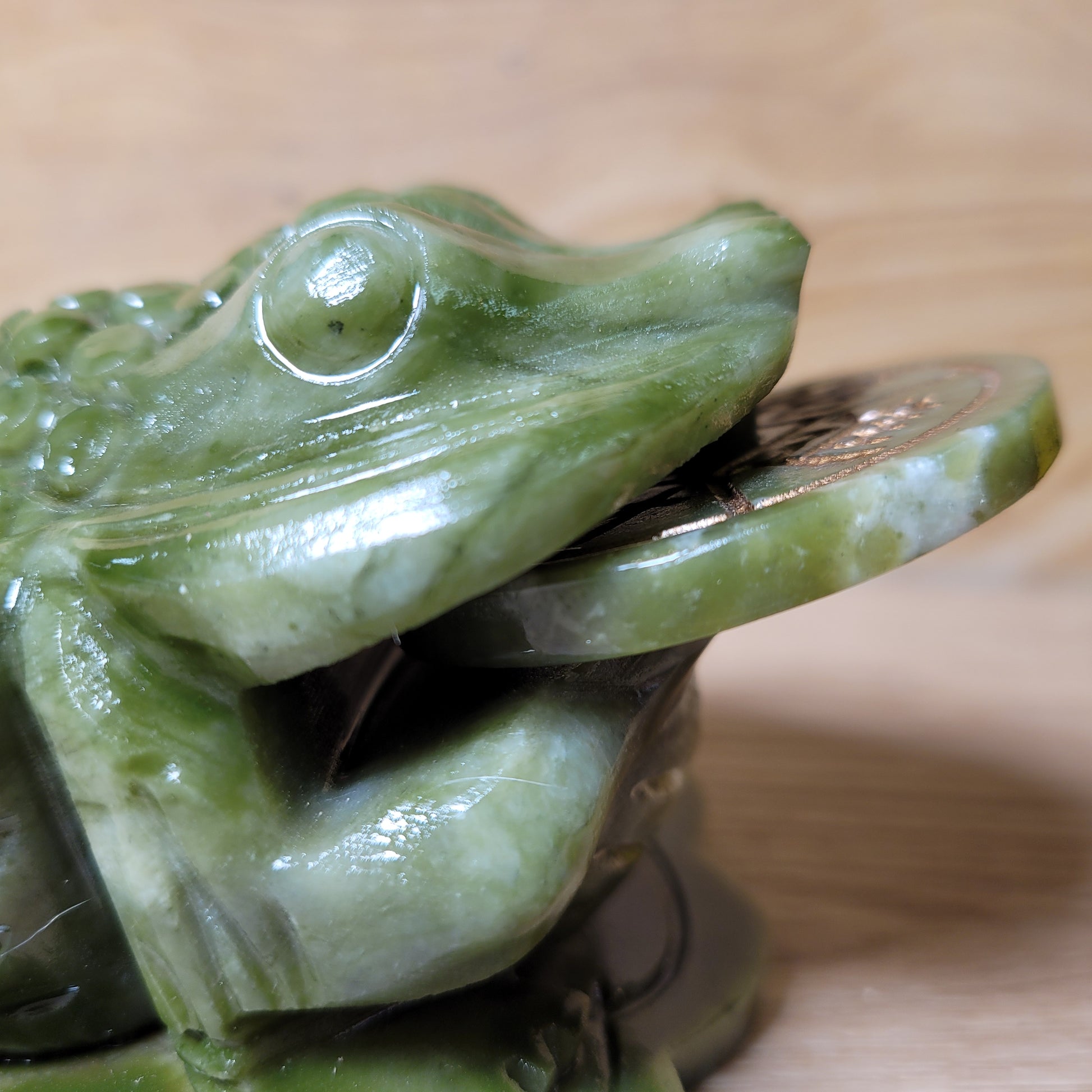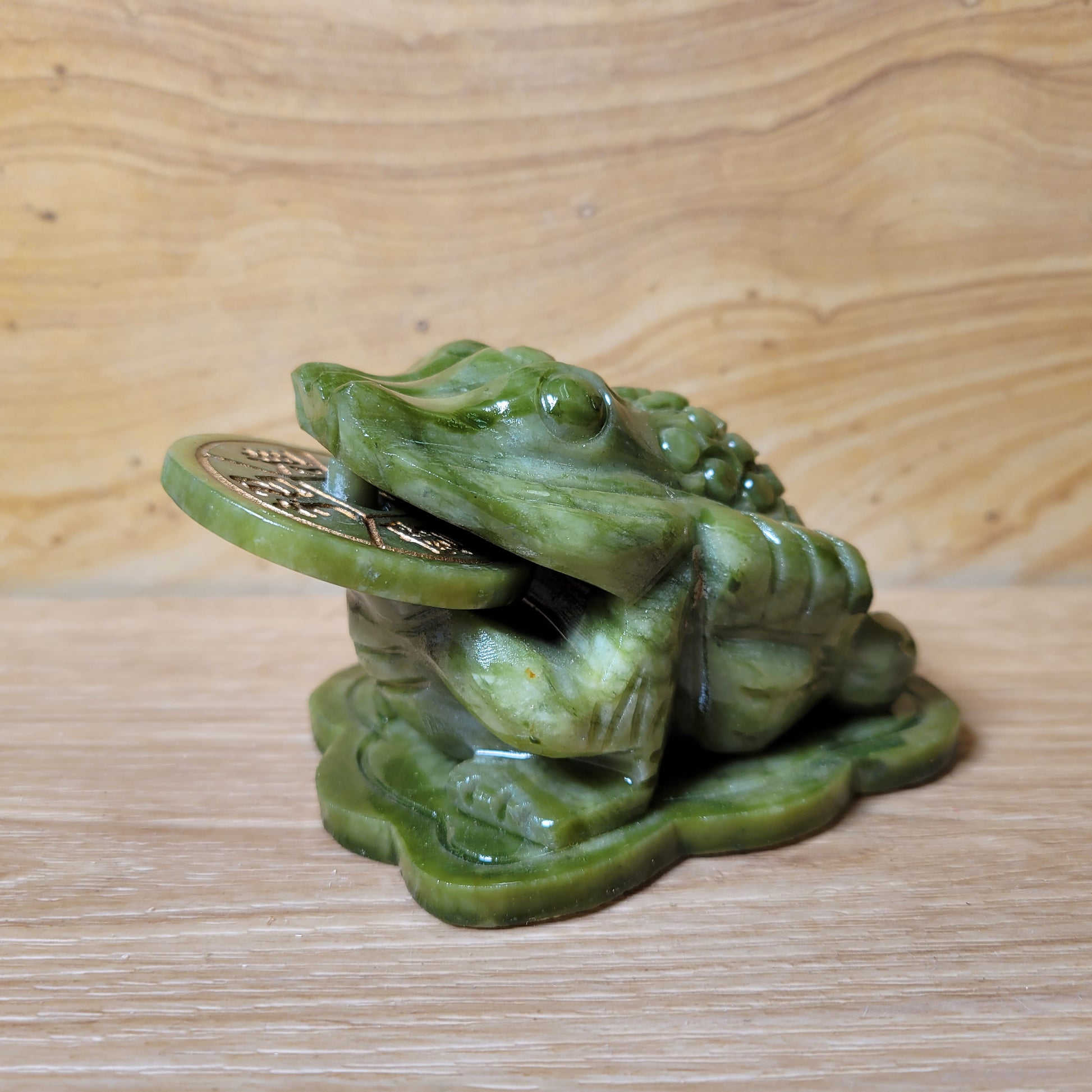 A Feng Shui Money Frog (often called a Three-Legged Frog or Toad of Fortune) is a symbol of wealth, prosperity, and good luck. This frog is hand carved and holds a spinning money coin in its mouth that is used to attract financial abundance and positive energy into the home or business. This frog is approximately