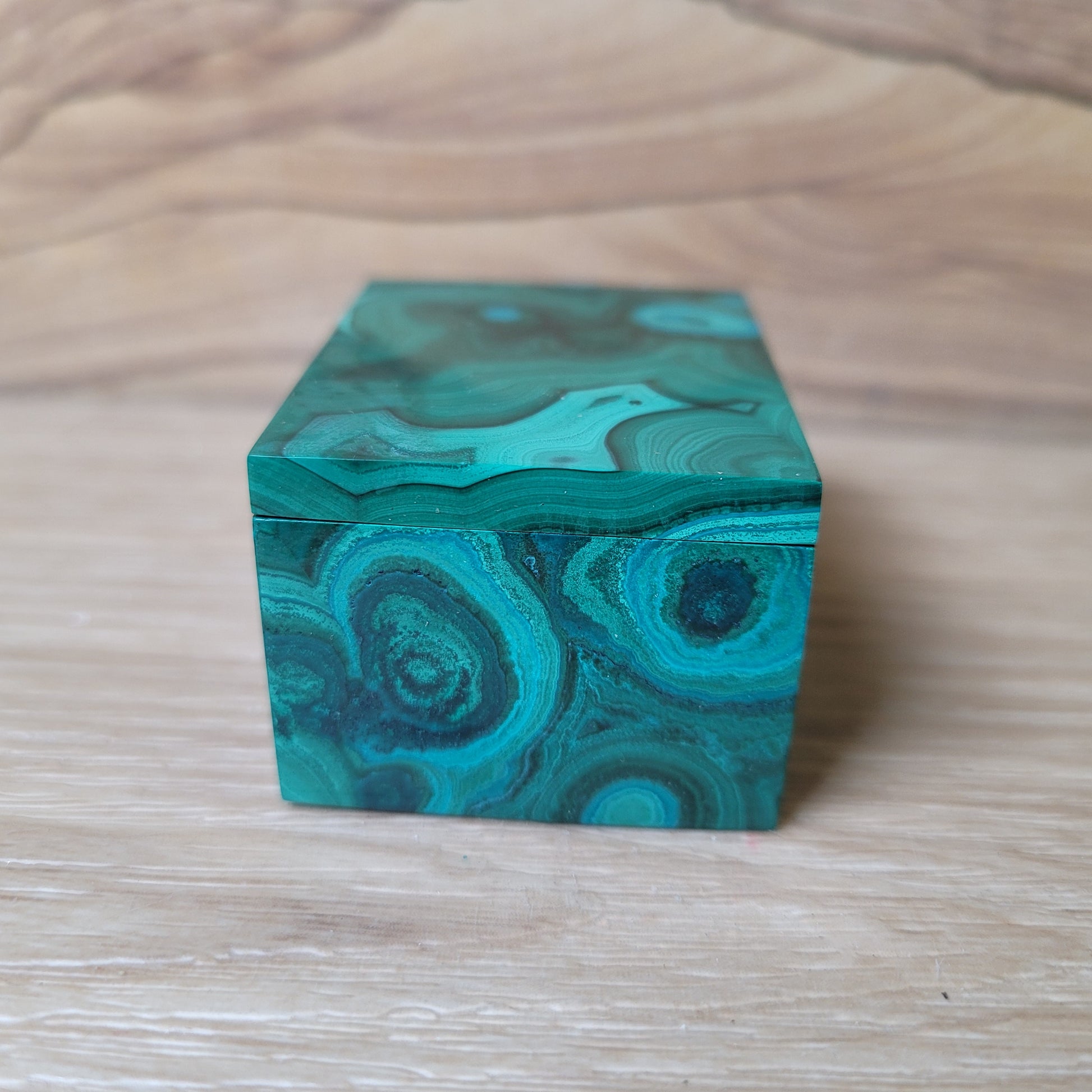 This elegant Malachite and Chrysocolla jewelry box is crafted from natural Congo Malachite, showcasing its rich green bands and unique patterns. Perfect for storing your favorite treasures, each box is one-of-a-kind, reflecting the beauty and natural variation of the stone.