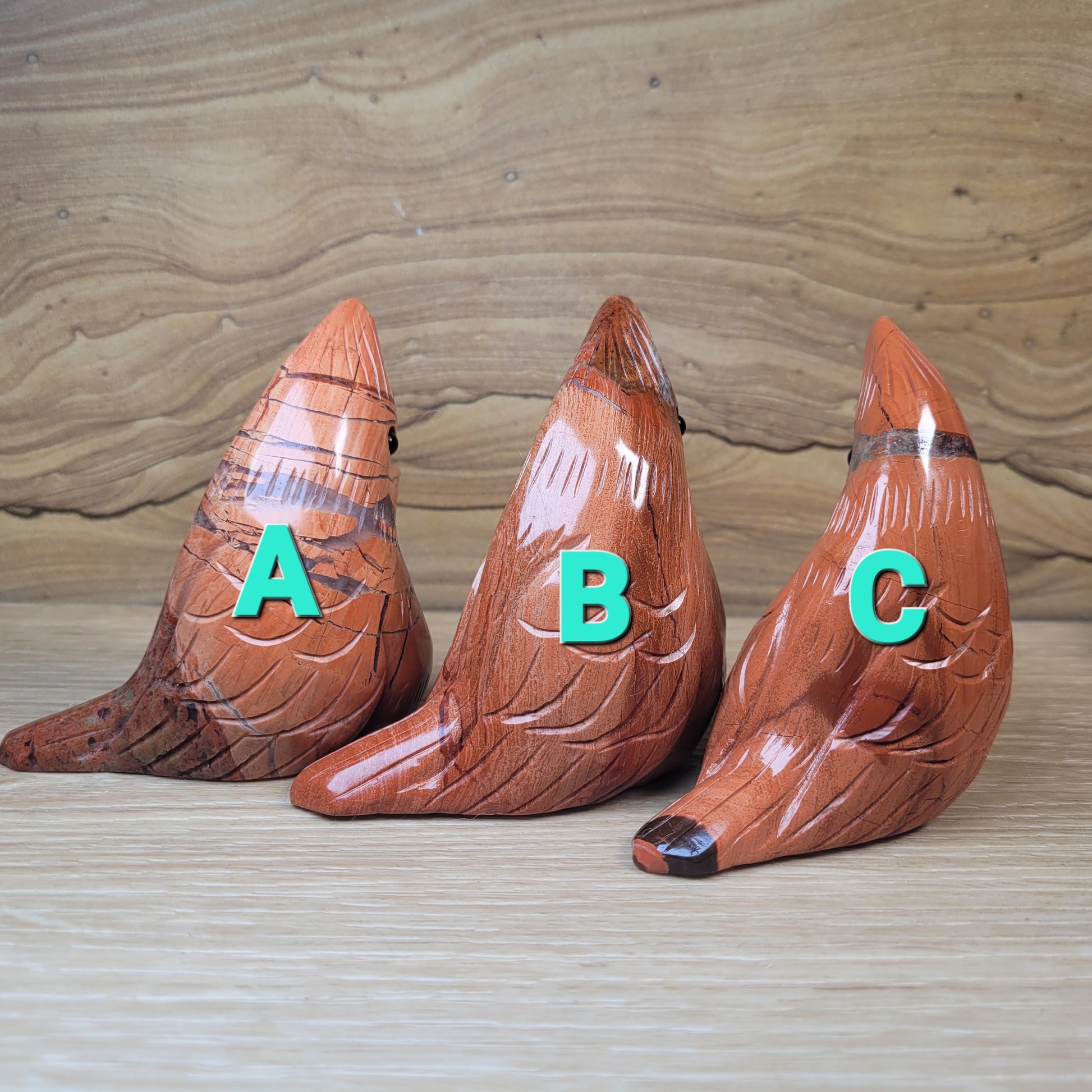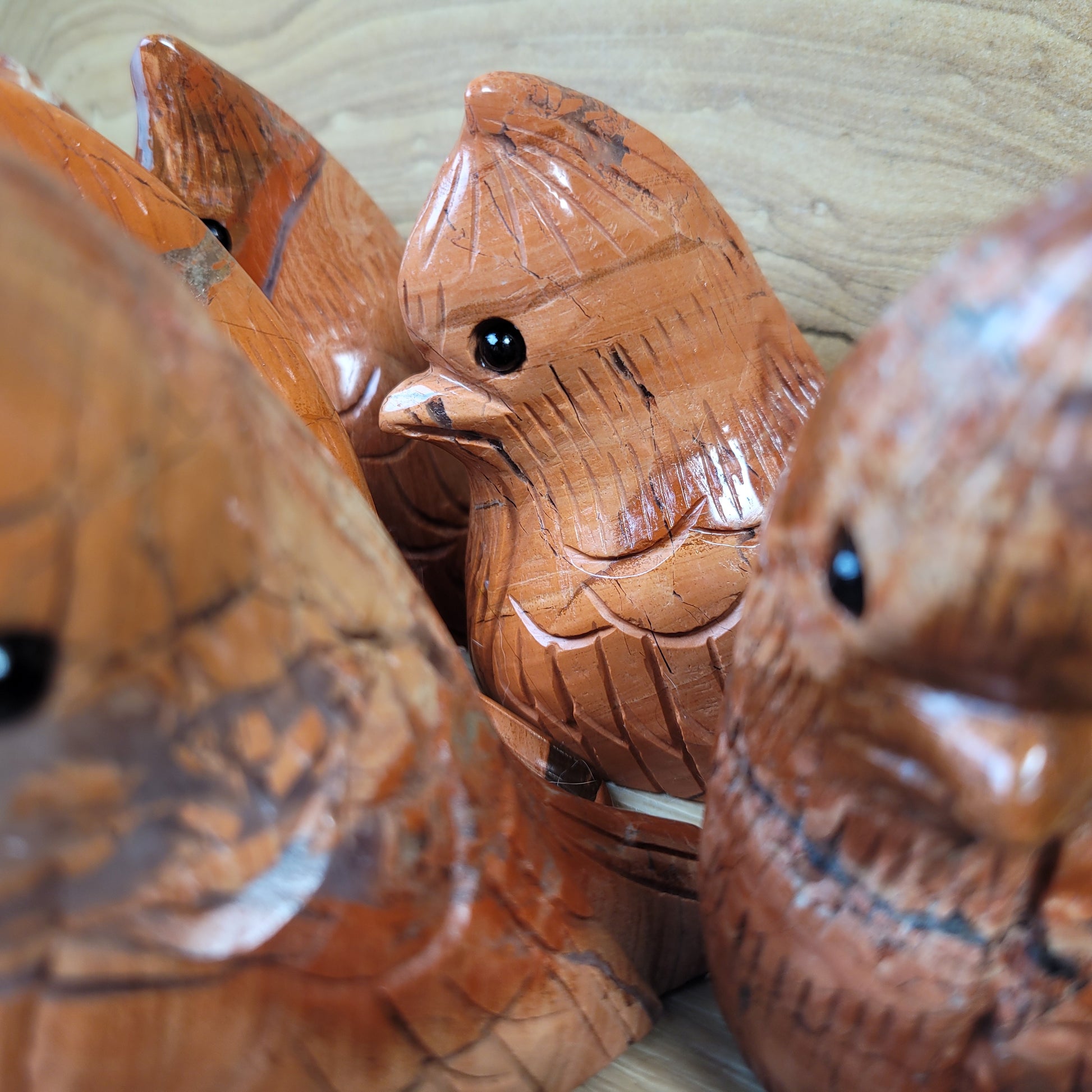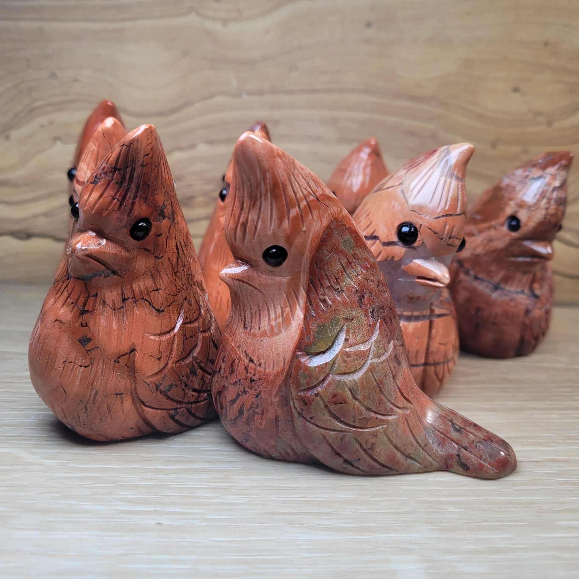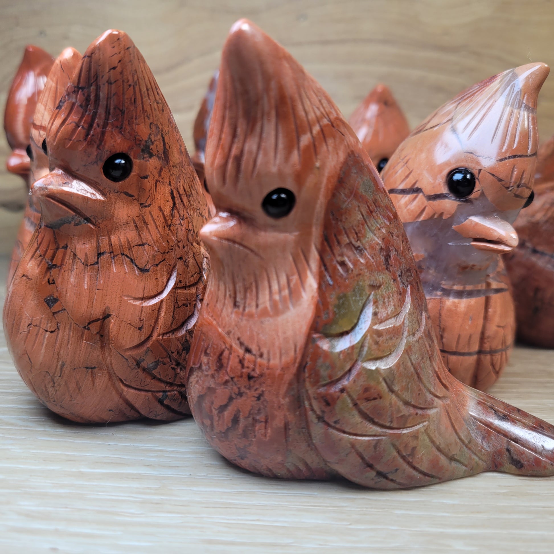 Beautiful hand-carved Cardinals made from Red Jasper. Each piece is unique with its vibrant coloring and black glass eyes. The cardinal shape adds a layer of symbolic depth - representing vitality, enthusiasm, courage, and a spirited connection to life’s energy.